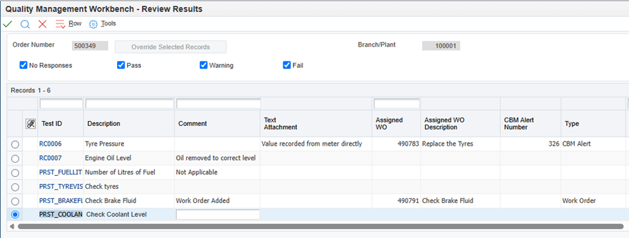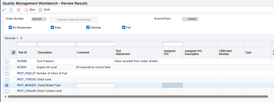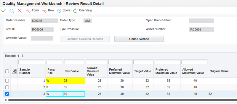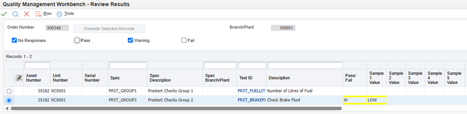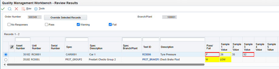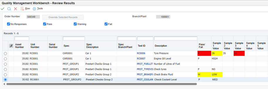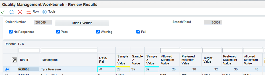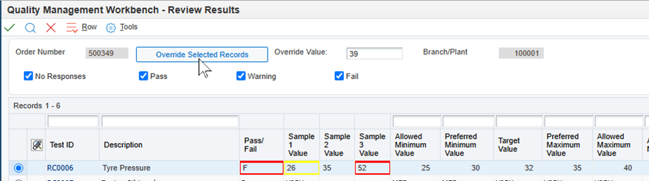 If the selected grid record has a Pass/ Fail state of “F” = Fail, then authorised users can click the Override Selected Records button to override all failed responses to either the nearest Preferred value, nearest Allowed value, Target value or a specified value depending upon the PQ353702 version Processing Options. Any responses that are “W”=Warning or “P”=Pass are not overridden.