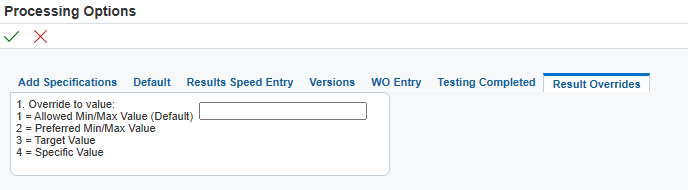If the Result Overrides method is set as 4 = Specific Value, then the user must provide an override response value that will result in either a Warning or Pass state for the overridden response.