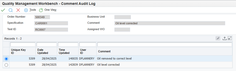 Comment Audit Log to view historic and current comment details with Date/Time/User audit references.