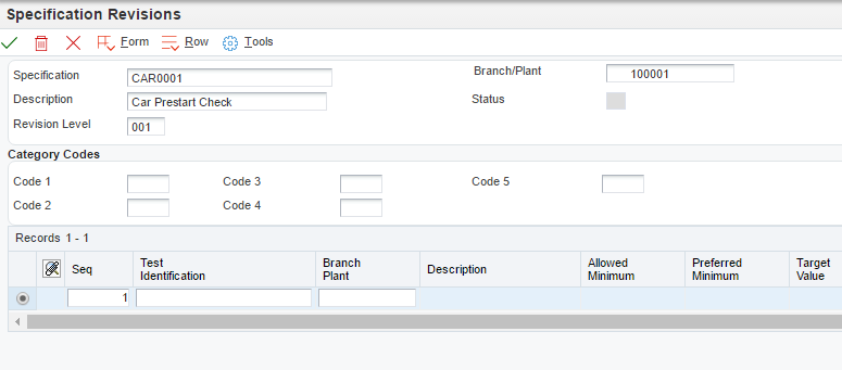 Specifications are setup using the standard Quality specification revisions application which can be defined on the JDE Task View Menu. This application can also be accessed directly from the Quality Management Workbench via the form exit “Spec Revisions”.