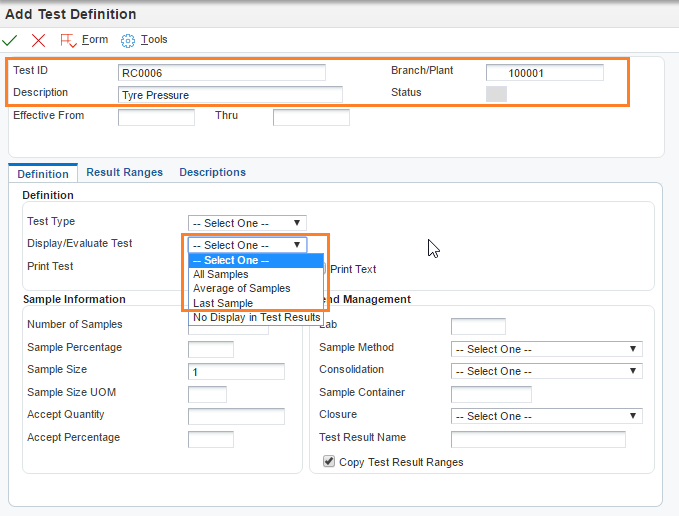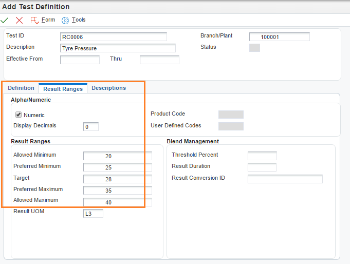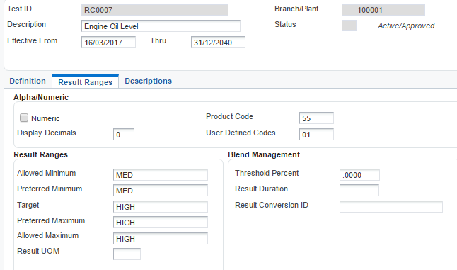 Branch/Plant is an optional field for test, specification and preference profile setup. The use of Branch/Plant must be considered prior to beginning the setup process. If the Blank branch is used, you must use Blank branch/plant for the test, specification and preference profile. If you wish to use a specific allowed range for a specific branch you must then setup a set of specification, test and quality preference profile for the specific branch individually.